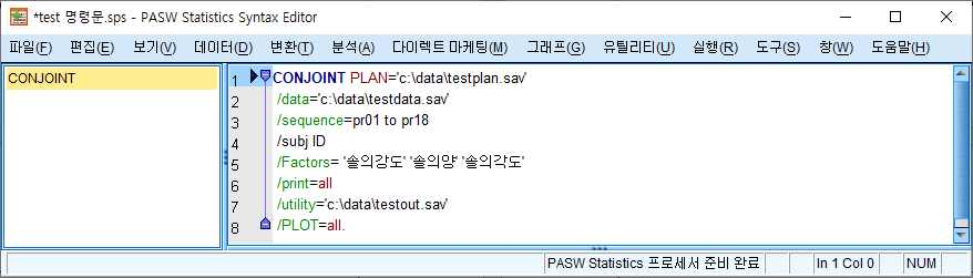■ [방법]: SPSS에서는 컨조인트 분석을 수행하기 위해서는 명령문의 입력을 통해 처리하도록