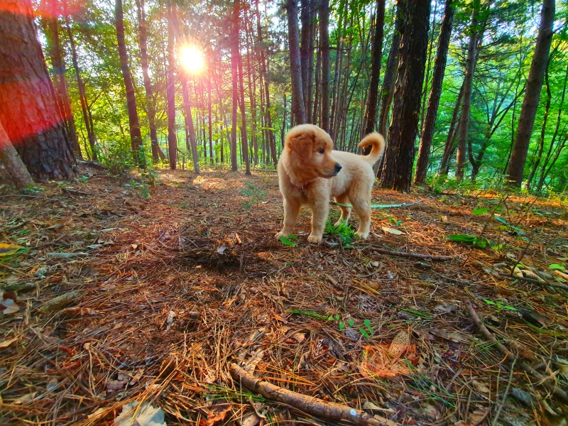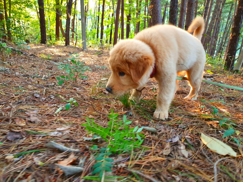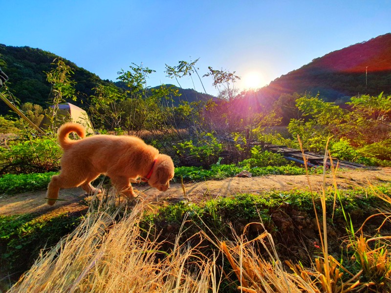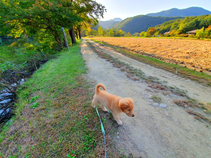 강물따라 놓인길을 시작으로 자연스럽게 이어지는 논밭길. 그리고 논밭길을 따라 걷다보면 그 길은 산속으로 이어지는 오솔길로 변합니다. 오늘 함께 했던 반려견은 강물만큼이나 숲길 역시 너무나도 좋아했습니다. 혼자 걸어도 좋았던 길을 강아지마저 좋아하니, 함께 공유할 수 있는 장소를 찾은 기쁨에서인지 공연히 기분이 좋아집니다. 잣나무숲이 펼쳐진 이곳은 공기의 냄새가 다릅니다. 오랜시간 쌓인 잣잎과 잣나무에서 뿜어져 나오는 특유의 상쾌함이 사룡리 시골길투어의 대미를 장식합니다.