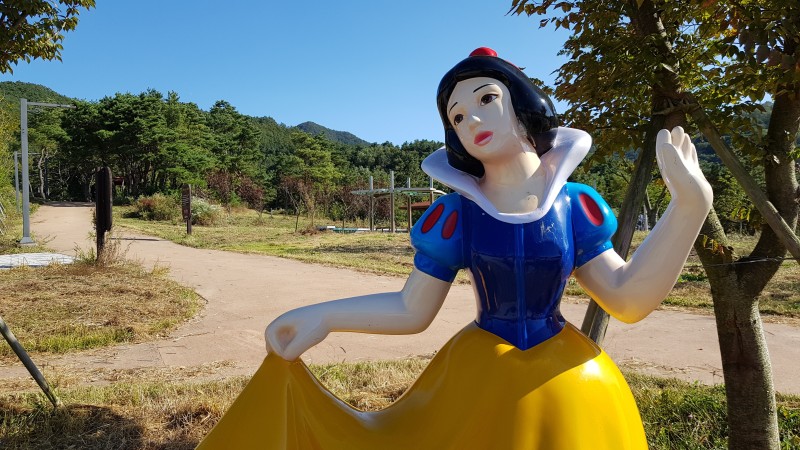 사과 안내문 옆에는 일곱 난쟁이와 함께인 백설 공주의 모형이 서있었습니다.