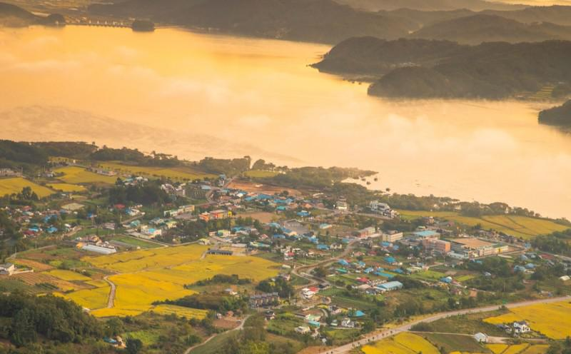 시간이 지나자 예당호 주변의 마을 위로 운해가 펼쳐지려 합니다. 저 들판도 이제는 추수를 끝낸 뒤겠죠?