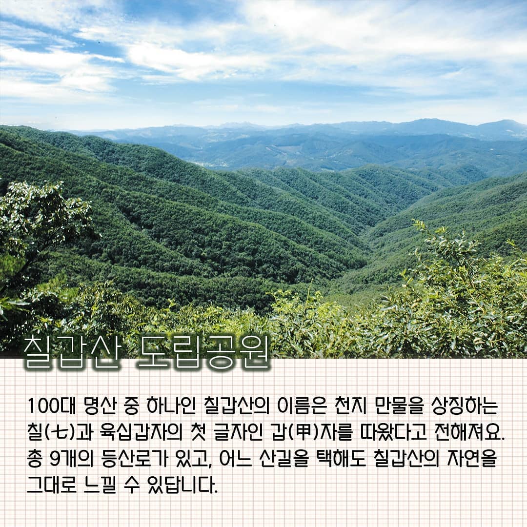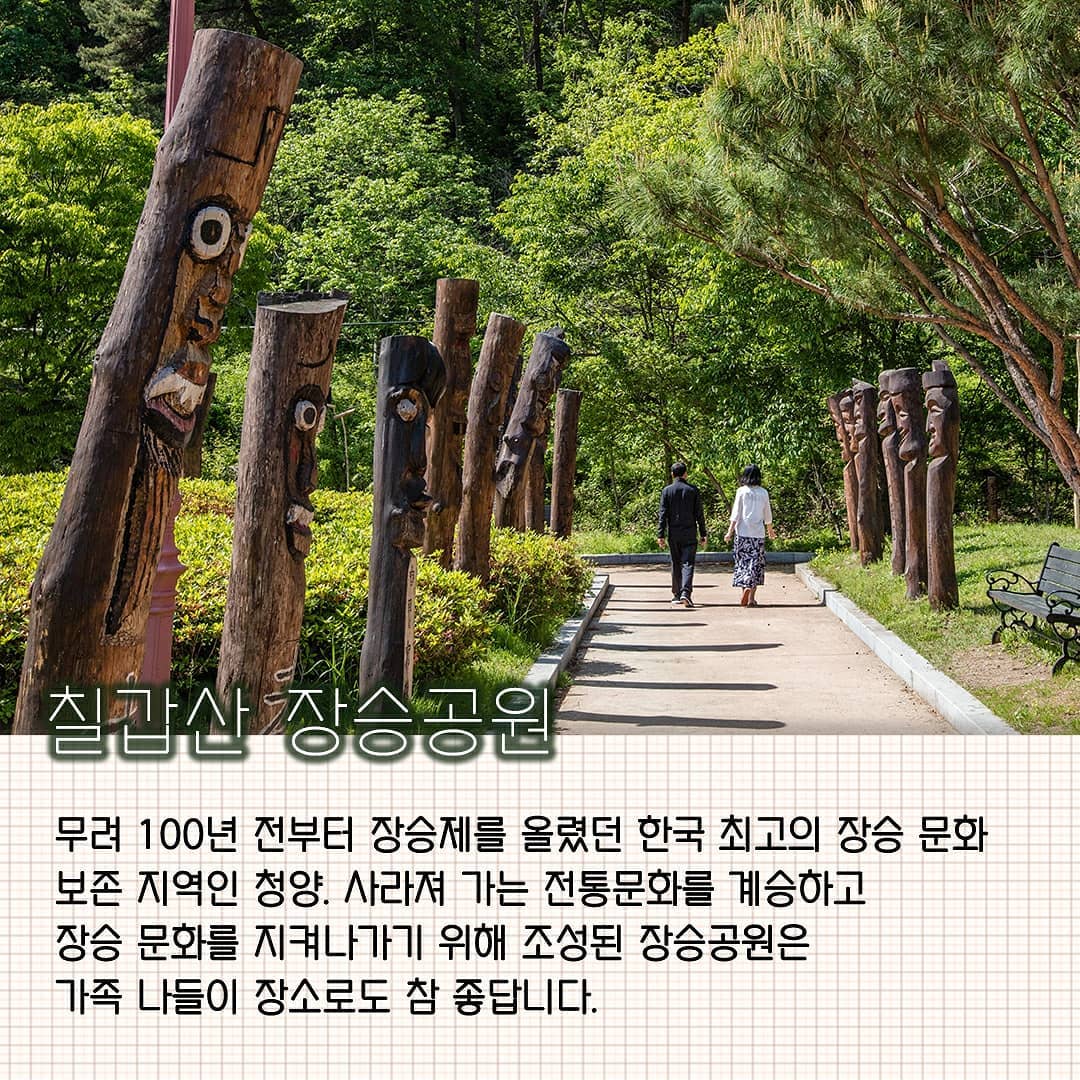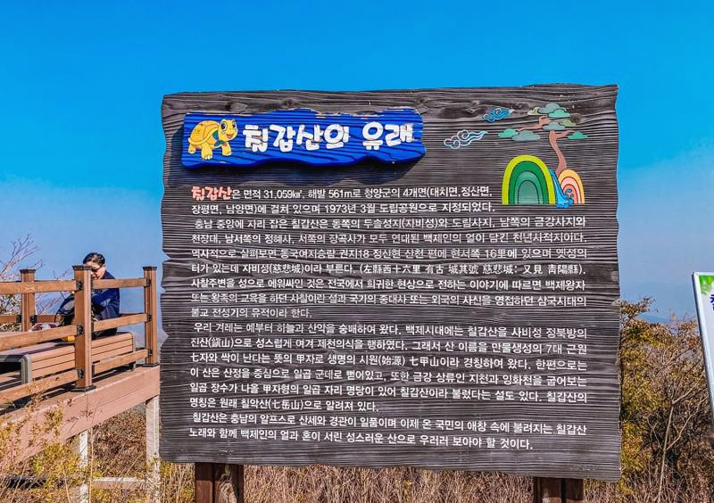 칠갑산의 유래에 대해서 잘 나옵니다. 백제시대에 칠갑산을 사비성 정북방의 진산으로 성스럽게 여겨 제천의식을 행했다고 합니다. 그래서 산 이름을 만물 생성의 7대 근원 '칠(七)'과 싹이 난다는 뜻의 '갑(甲)'자으로 해 생명의 시원 칠갑산이라 부르게 되었습니다.