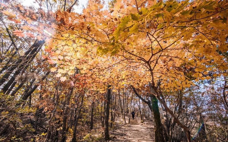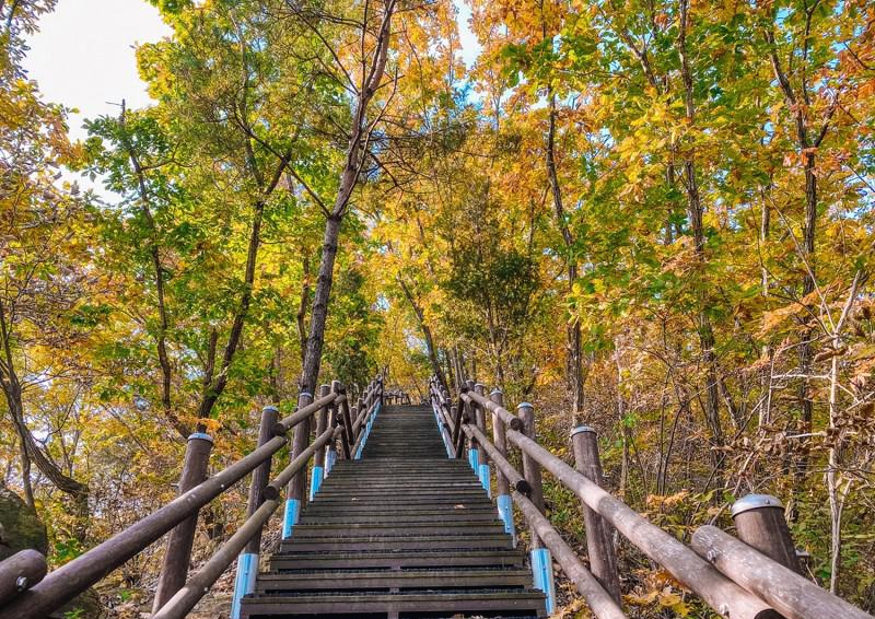 다른 곳에 비하면 가을 단풍이 도드라지지 않아 아쉽지만 한두 그루 있는 단풍나무가 가을 등산의 기분을 만들어줍니다. 현재 칠갑산은 한창 등산로 정비가 진행 중이라 조금 더 안전한 등산을 할 수 있습니다. 새로 깔린 데크 계단 덕분에 흙길을 덜 미끄럽게 오를수 있었답니다.