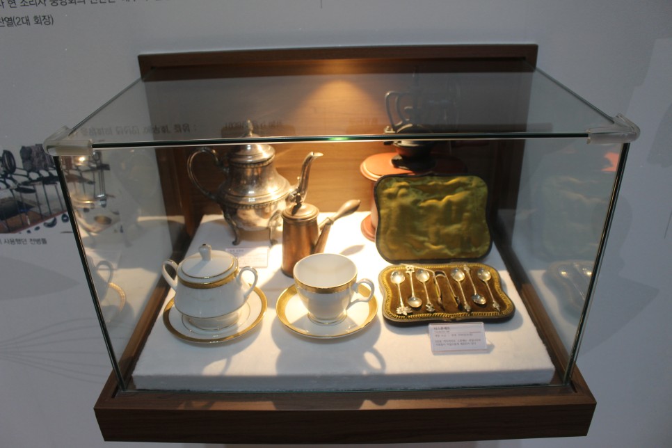 역사를 기록한 글 아래에는 서양식 도입기에 왕실에서 사용하던 커피잔부터 티스푼세트 등이 전시되어 있었는데요.